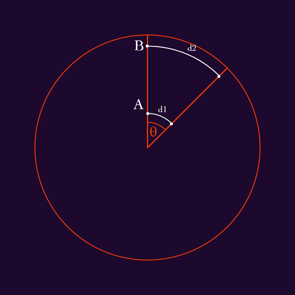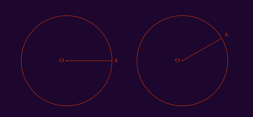 Prenons un exemple trivial mais parlant : un cercle est défini par son rayon, ici je l’appelle OA. On voit que si j’applique une rotation de -30° à mon cercle de centre O, le rayon reste le même : c’est un invariant, lié au fait que notre cercle soit parfaitement symétrique par rotation.