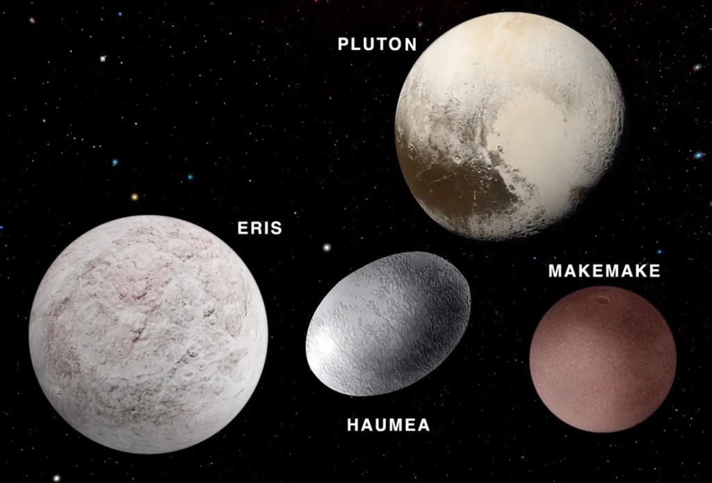Au-delà de l’orbite de Neptune, entre 30 et 50 UA, on retrouve des milliards d’objets glacés, faits d’eau, d’ammoniac ou de méthane, qui constituent la ceinture de Kuiper. Parmi ces objets, on trouve la planète naine Pluton, qui a perdu son titre de planète en 2006, son satellite Charon, mais aussi Eris, Makémaké ou encore Haumea. Cette ceinture d’astéroïdes « secondaire » est, comme la ceinture primaire, une relique du disque protoplanétaire à l’origine de notre Système solaire.