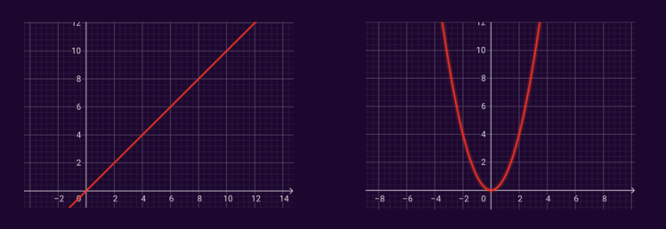 Deuxième exemple, pour le sport : imaginons une fonction, la plus simple possible, la fonction affine f(x)=x, qui pour chaque valeur de x, renvoie cette même valeur (à gauche) et appliquons une transformation qui consiste à renvoyer, pour chaque valeur de x, son carré. On obtient alors la fonction carrée (à droite), plus du tout linéaire, mais parabolique. On voit bien que la fonction a été changée. Et pourtant, pour les valeurs x=0 et x=1, la fonction renvoie également f(x) = 0 et f(x) = 1. En effet 0 et 1 élevés au carré restent 0 et 1 ! Ces points n’ont donc pas bougé, ce sont des invariants algébriques.