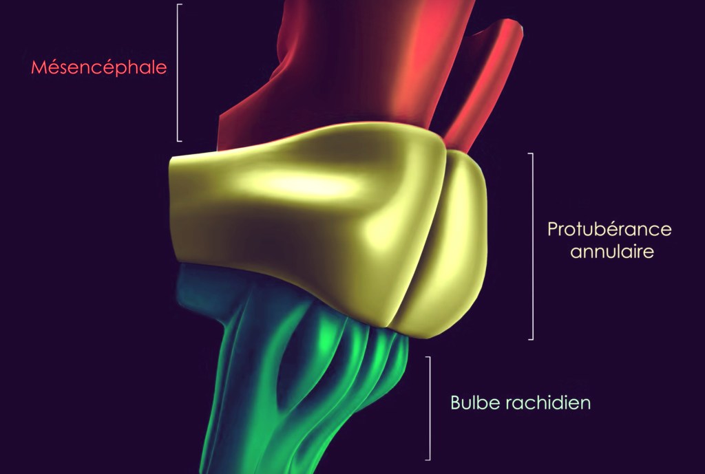 Le tronc cérébral assure le lien avec le reste du corps via la moelle épinière. Il régule la respiration, le rythme cardiaque, la pression artérielle, la transpiration et la déglutition. C’est aussi lui qui est responsable de votre état conscient, éveillé et vigilant. Il est lui-même constitué de trois sous-structures : le mésencéphale, la protubérance annulaire (Pont de Varole) et le bulbe rachidien.